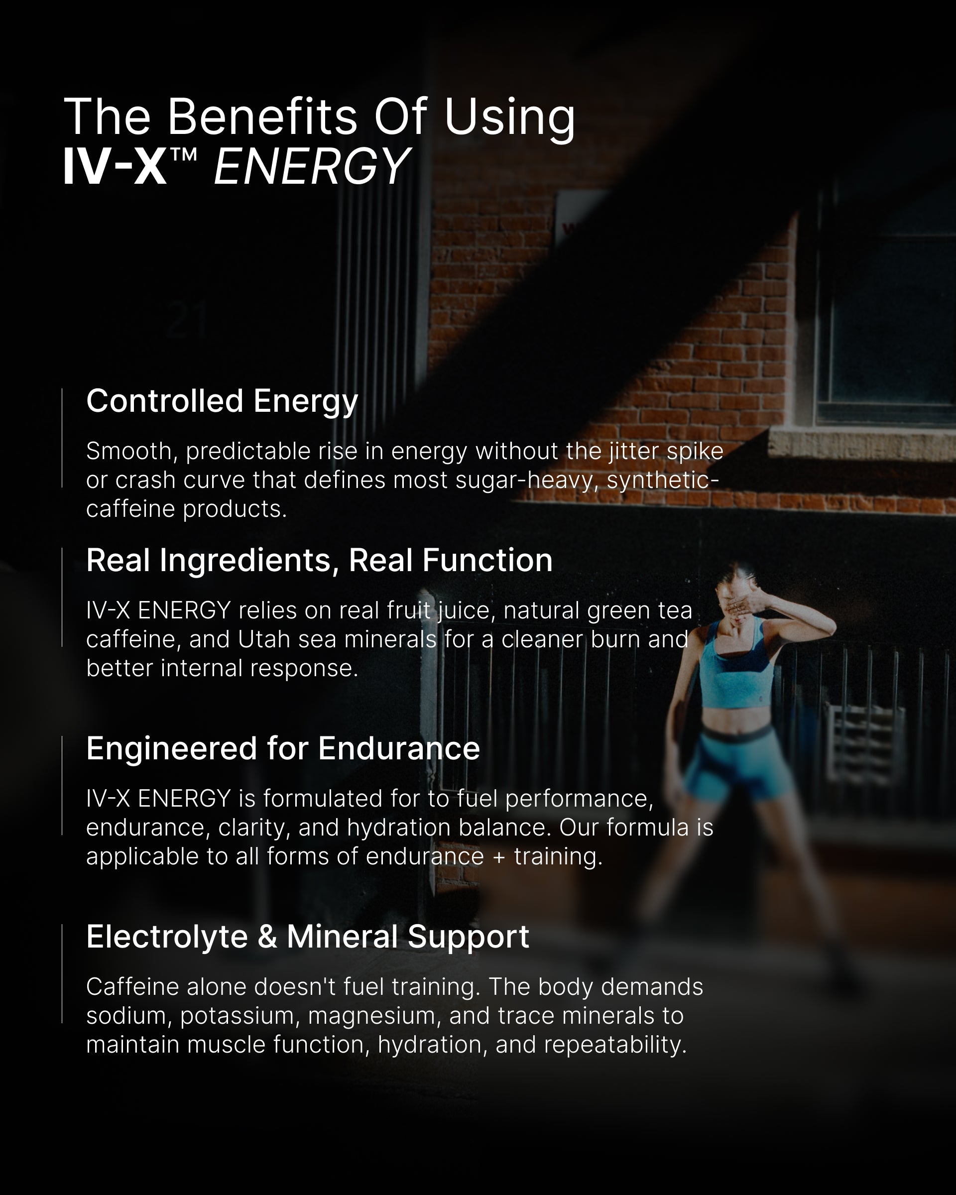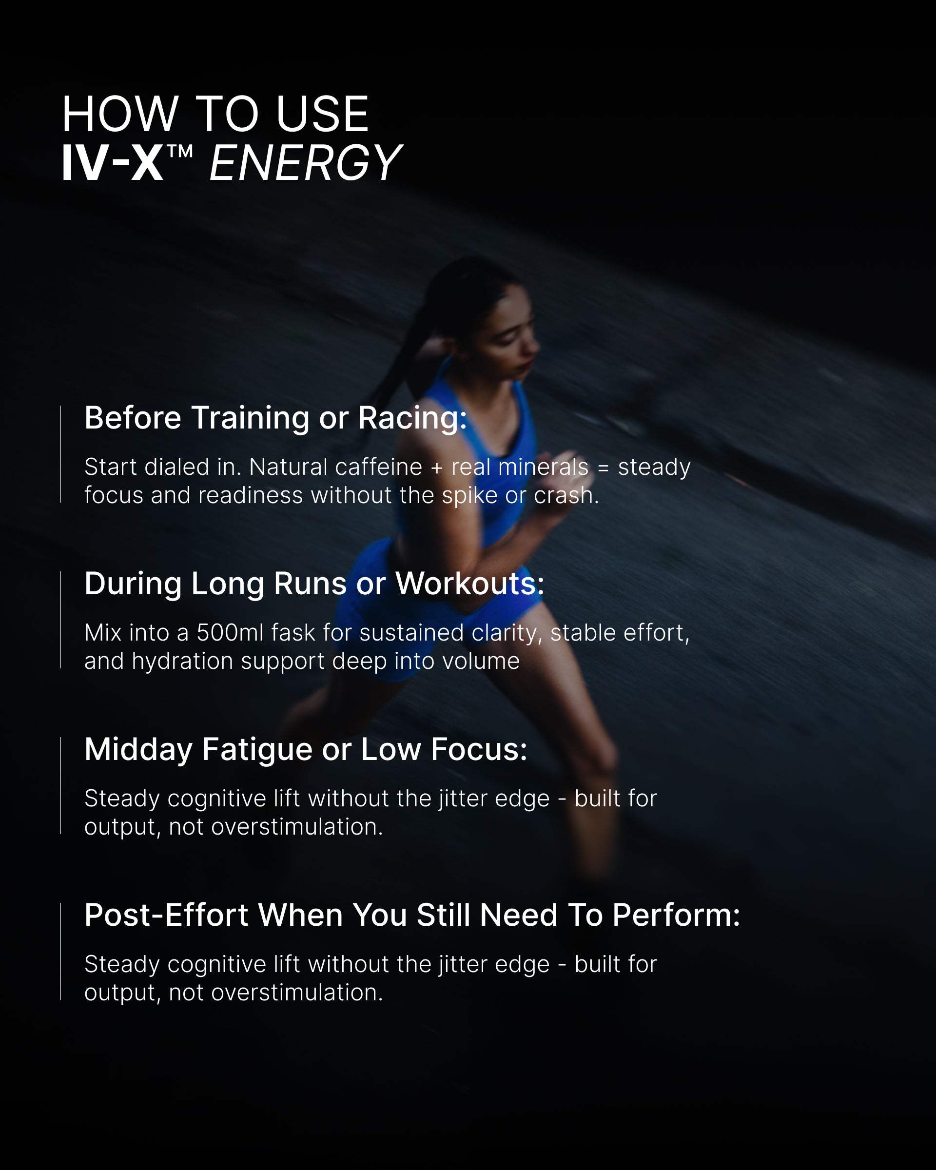 IV-X delivers controlled energy, clarity, and stable output. Clean caffeine, trace minerals, and a non-carbonated system create activation without spikes, crash, or GI issues.